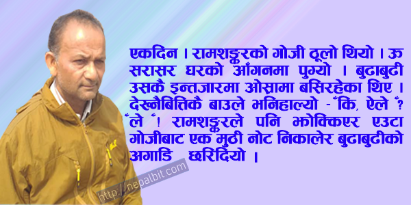 रमेन्द्र कोइराला " बौवा ! तलब एलो ?” हरिशङ्करले छोरालाईसोध्यो ।“नै, अख्नि निकासै नै भेल्छे !” छोरा रामशङ्करलेजवाफ दियो ।"दसै“...