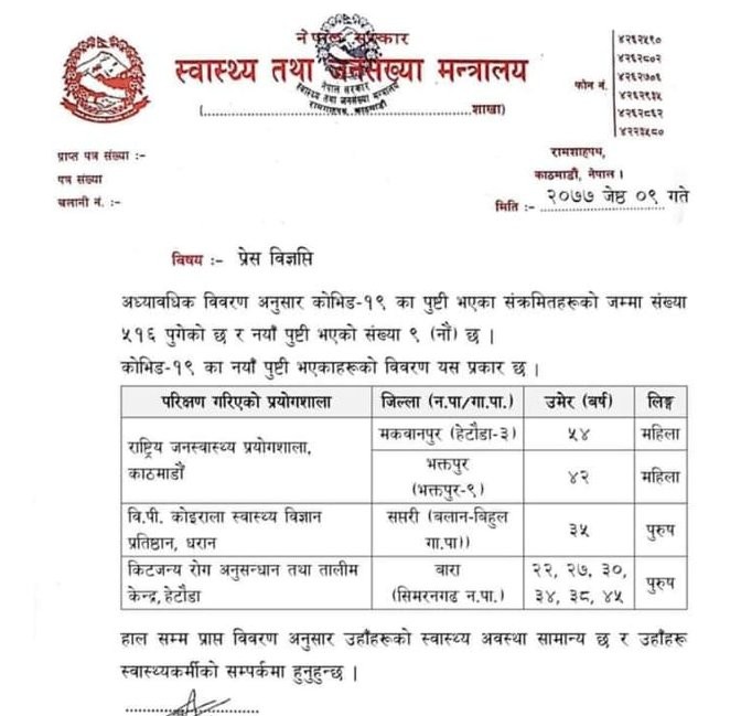 नेपालमा थप ९ जनामा कोरोनाभाइरसको संक्रमण पुष्टि, संक्रमितको संख्या ५ सय १६ पुग्यो