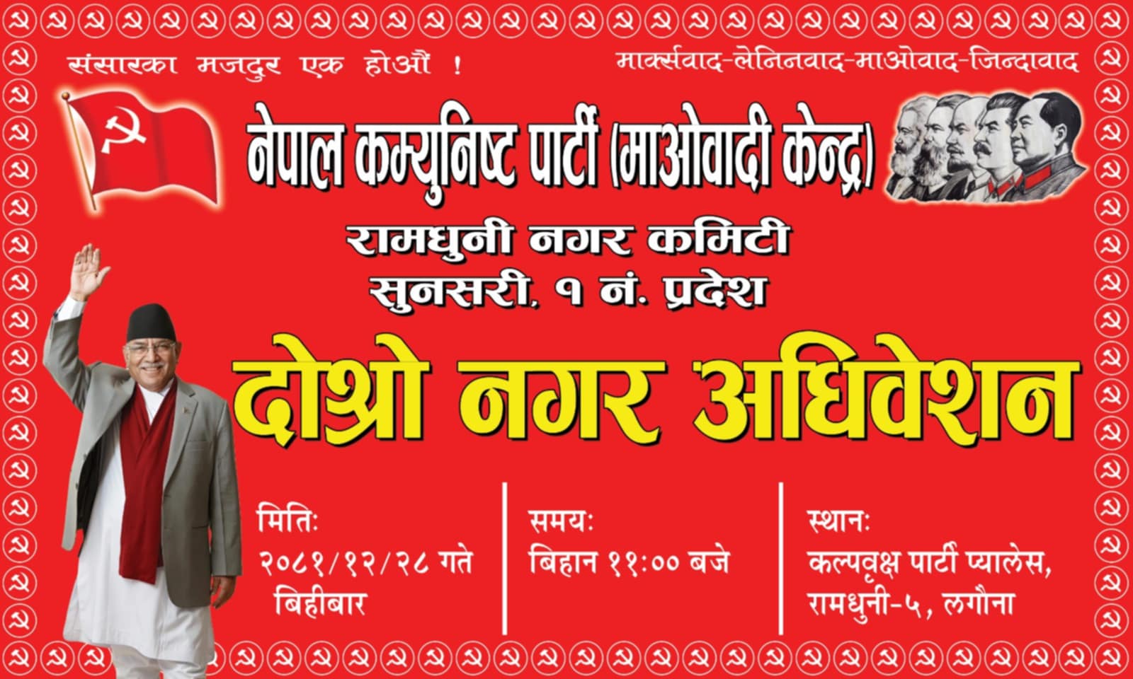 झुम्का, नेकपा माओवादी केन्द्र रामधुनीको दोस्रो नगर अधिवेशन यही चैत २८ गते विहिबार हुनेभएको छ । माओवादी केन्द्र रामधुनीका नगर अध्यक्ष बलराम चौलगाईका अनुसार चैत २८ गते विहिवार विहान ११ बजेदेखि झुम्का लगौना चौकको एक पार...