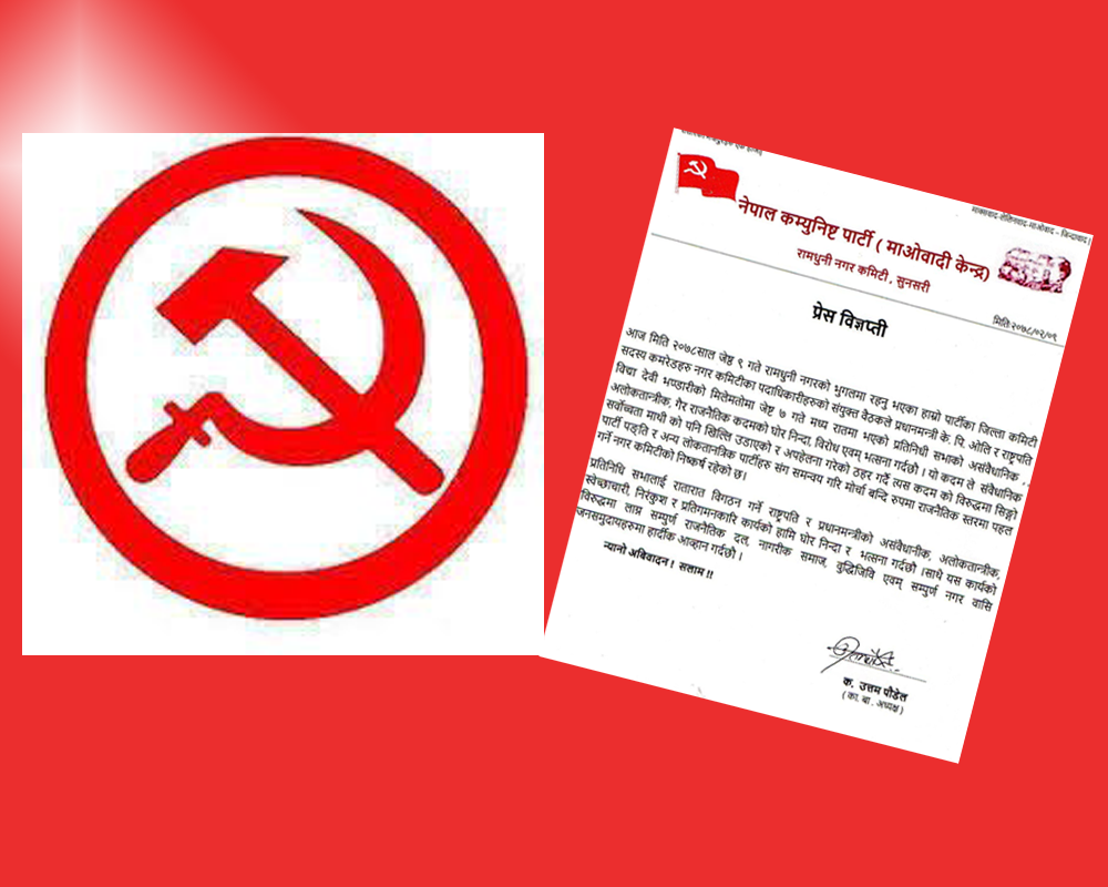२०७८ जेठ ९ गते, झुम्का । नेपाल कम्युनिष्ट पार्टी (माओवादी केन्द्र) रामधुनी नगर कमिटी, सुनसरीले प्रधानमन्त्री र राष्ट्रपति विद्यादेवी भण्डारीको मिलेमतोमा गरिएको संसद विघटनको विरोध एवं भत्सर्ना गरेको छ ।&nb...