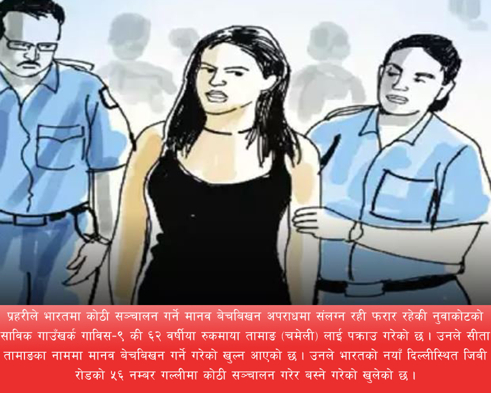 २०७७ फागुन २८ गते, काठमाण्डौं । नेपाली महिलाले भारतमा पुगेर कोठी सञ्चालन गरेको फेला परेको छ । उनले नेपालबाट महिलालाई लैजाने र वेश्यावृत्तिमा लगाउने गरेको खुल्न आएको छ । प्रहरीले भारतम...
