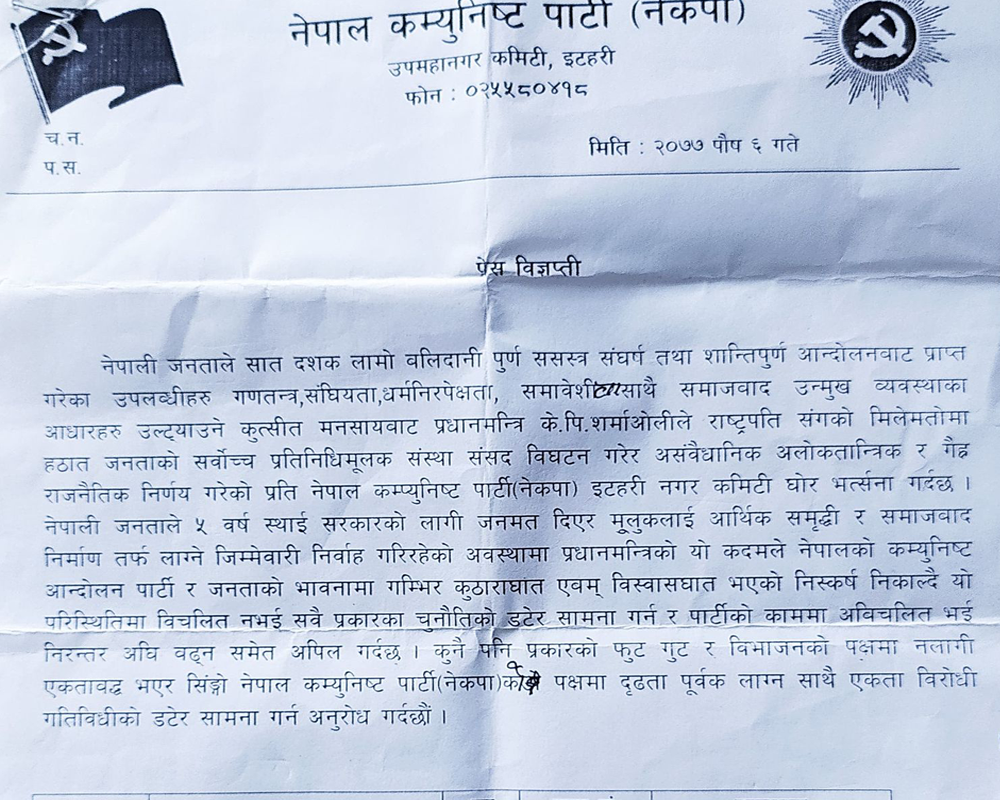 २०७७ पुस ९ गते, इटहरी । नेकपा इटहरी उप–महानगरपालिका का २० ओटै वडा कमिटिले ओली सरकारले गरेको संसद विघटनको विरुद्धमा एक जुट हुने घोषणा गरेका छन् । नगर कमिटिले यस अघि नै विज्ञप्त प्रकाशित गर्दै विरोध जनाइसकेको छ ।