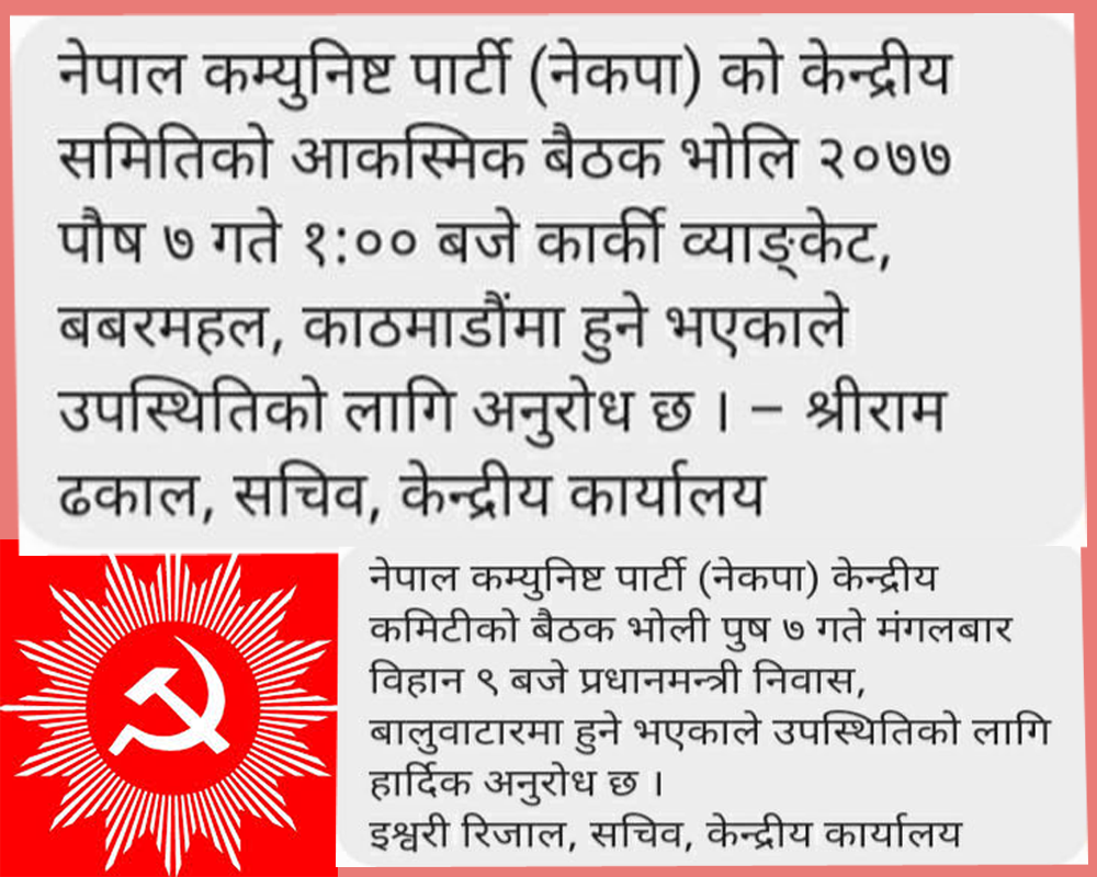 २०७७ पुस ६ गते, इटहरी । नेपाल कम्युनिष्ट पार्टीका दुवै अध्यक्षले प्रचण्ड र केपी ओलीले पुस ७ गतेका लागि छुट्टा–छुट्टै केन्द्रीय समितिको बैंठक वोलाउनु भएको छ । प्रचण्ड–ओली समुहले हिजो नै स्थायि समितिको ब...