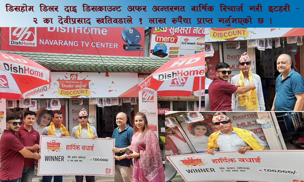 असोज १६ गते, इटहरी । डिसहोम डिलर दाइको डिसकाउन्ट अफर अन्तरगत बार्षिक रिचार्ज गरी इटहरी – २ का देवीप्रसाद खतिवडाले १ लाख रुपैया प्राप्त गर्नुभएको छ । बार्षिक रिचार्ज गर्ने मध्येबाट खतिवडाले यो पुरस्कार प्राप्...