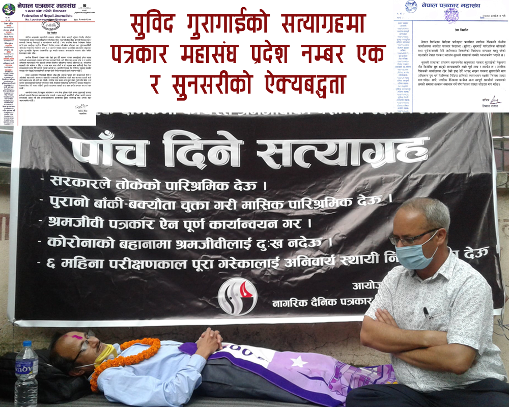 असोज ७ गते, इटहरी । पत्रकार सुविद गुरागाइको सत्याग्रहमा पत्रकार महासंघ प्रदेश नम्बर एक र सुनसरी शाखाले ऐक्बद्धता जनाएका छन । प्रेस विज्ञप्ती जारी गर्दै गुरागाइको सत्याग्रहमा ऐक्बद्धता जनाएका हुन । काठमाण्डौंबाट प्रकाशित नाग...